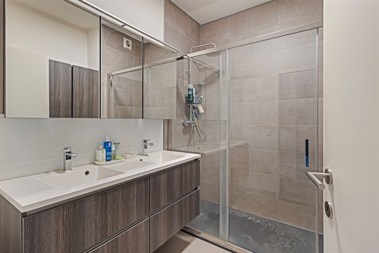 Moderne badkamer: voorzien van een ruime inloopdouche en een dubbele lavabo met stijlvol meubel