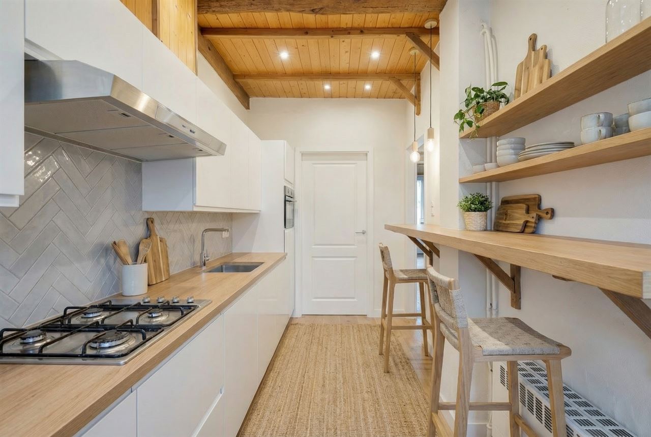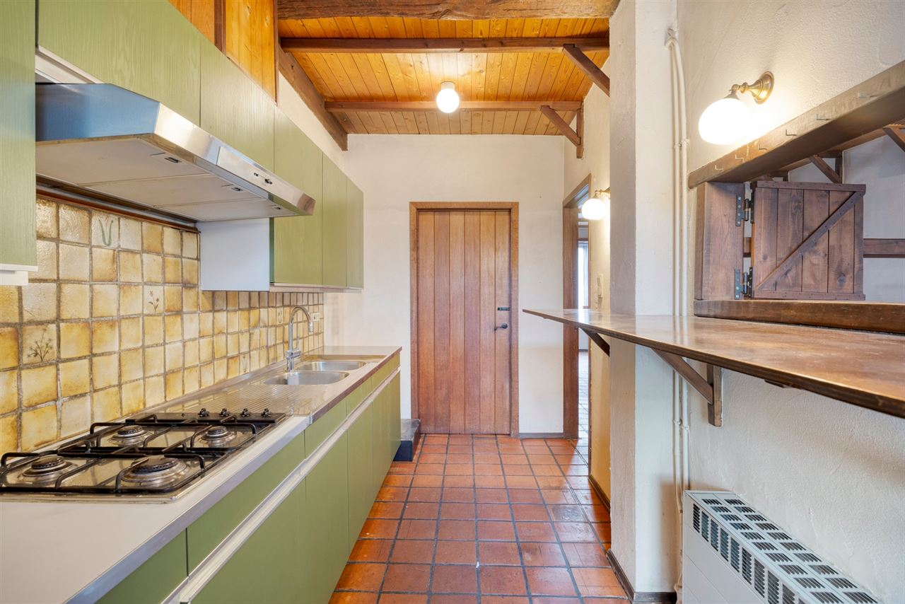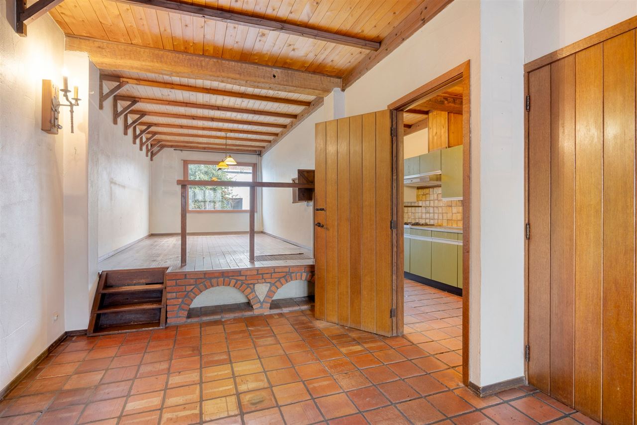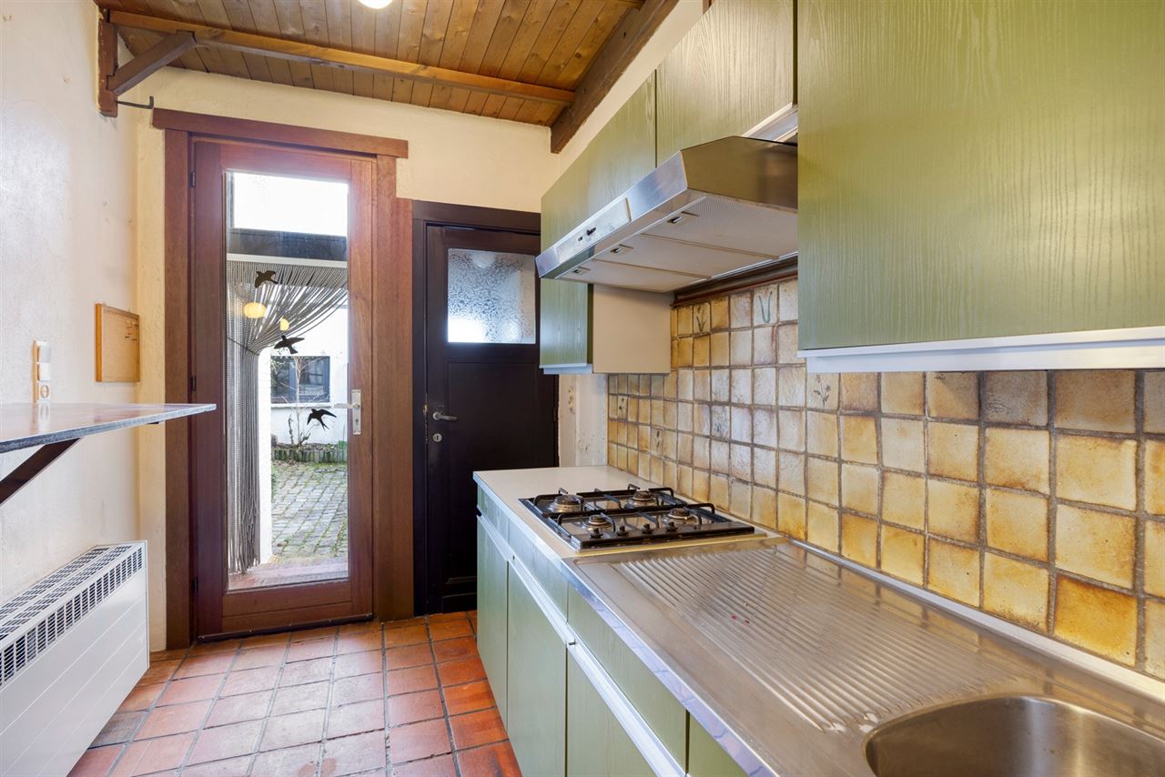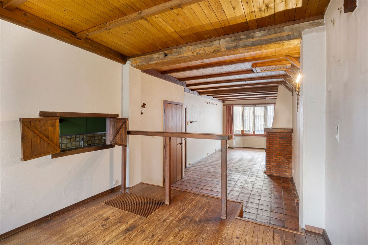 Via de inkomhal kom je in de lichtrijke leefruimte waar gezelligheid en karakter hand in hand gaan. Aan de straatzijde bevindt zicht de sfeervolle zithoek, terwijl het iets hoger gelegen eetgedeelte een speelse dynamiek en open gevoel creëert. Dit subtiele hoogteverschil geeft de ruime extra cachet.